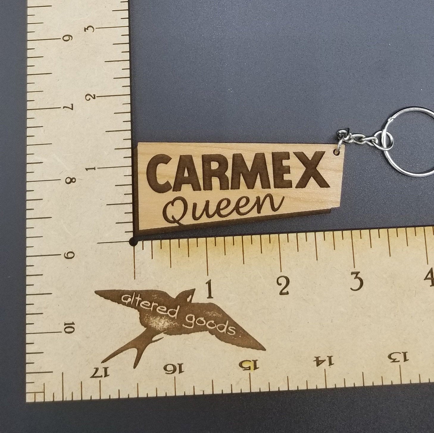 Laser engraved 3 inch long 2 inch wide cherry wood keychain. Carmex queen on one side and our logo on the back. If adding a name on back please add in note to seller.