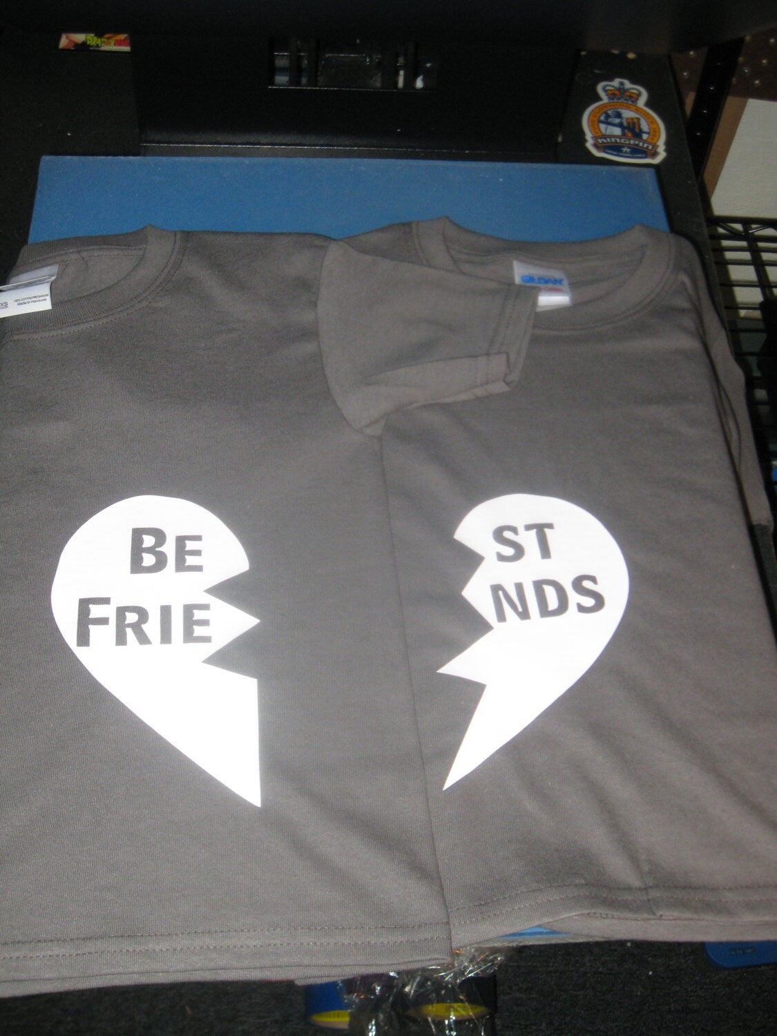 Keep one for your child and give one to their best friend. Sold in pairs, email us with the 2 sizes you need. We will do our best to get any variation in color shirt or design you would like. This link is the basic shirt we use for kids to give you an idea on color selection http://www.mygildan.com/Categories/T-Shirts/Short-Sleeve//p/5000B.
