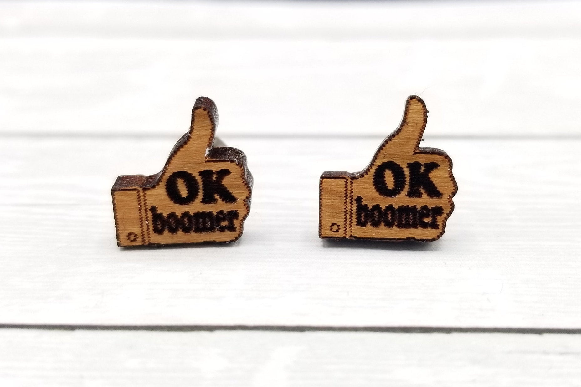 Cherry wood laser engraved and cut ok boomer thumbs up earrings with post back.