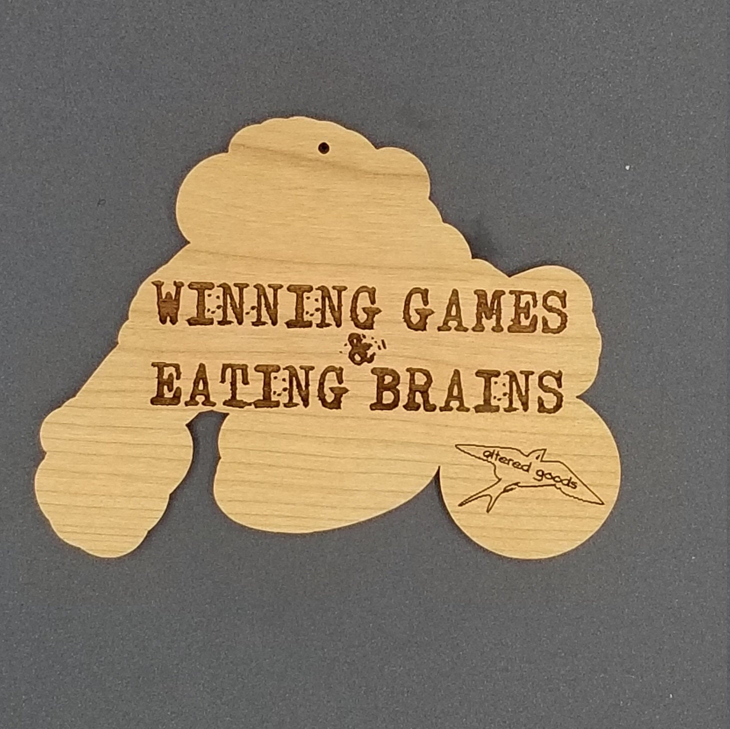 Laser engraved 4 inch cherry hardwood ornament. Zombie soccer player on one side and winning games and eating brains with our logo on the back.