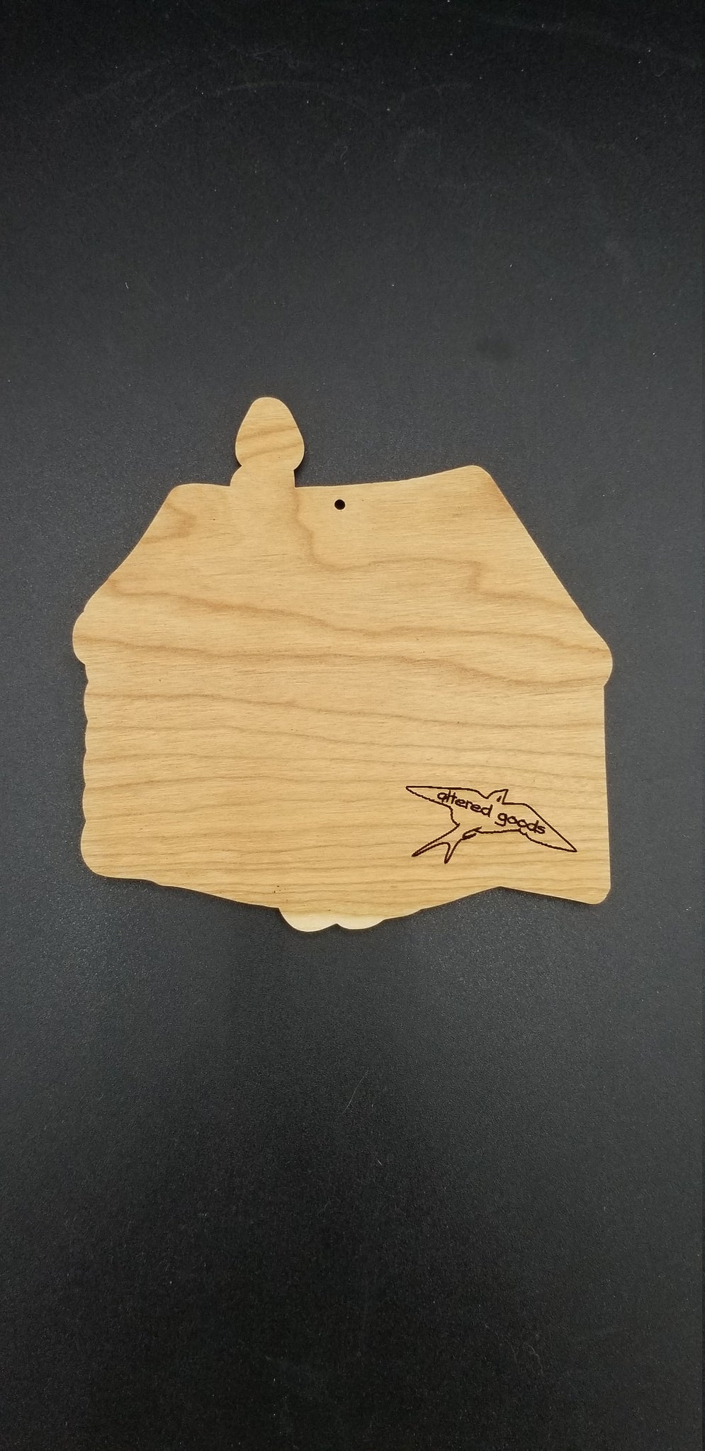 Laser engraved 4 inch long cherry hardwood ornament with our logo on the back. Please add message for roof in note to seller. A few words is best.