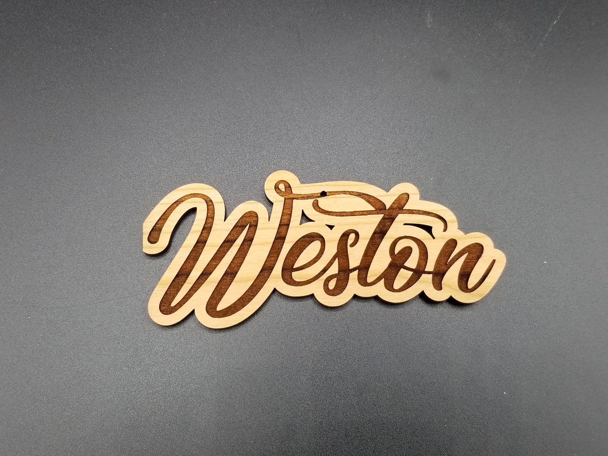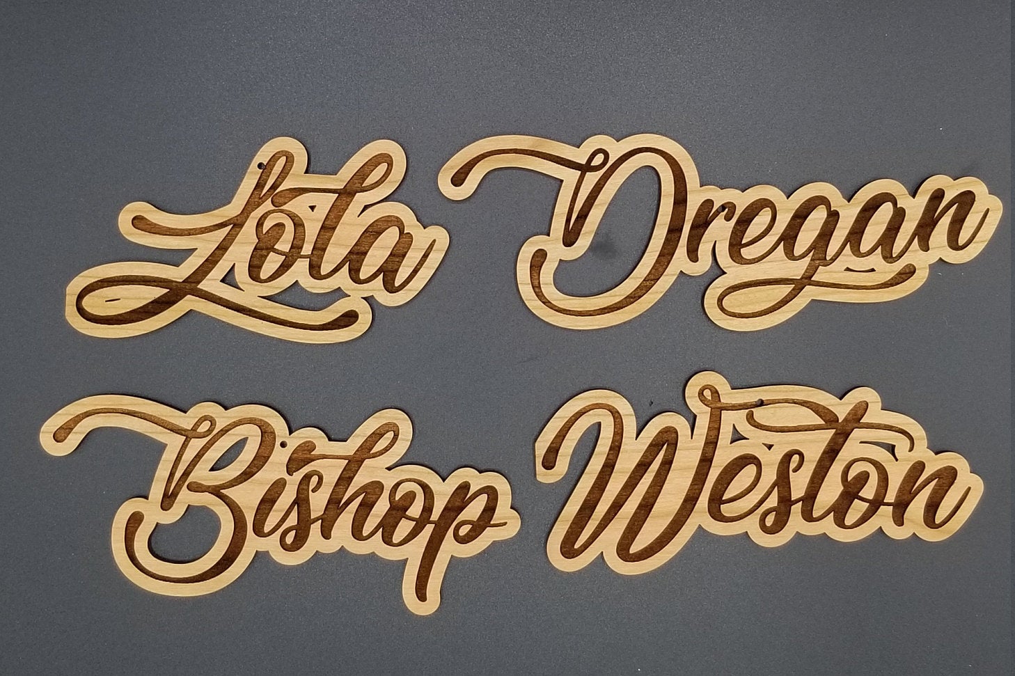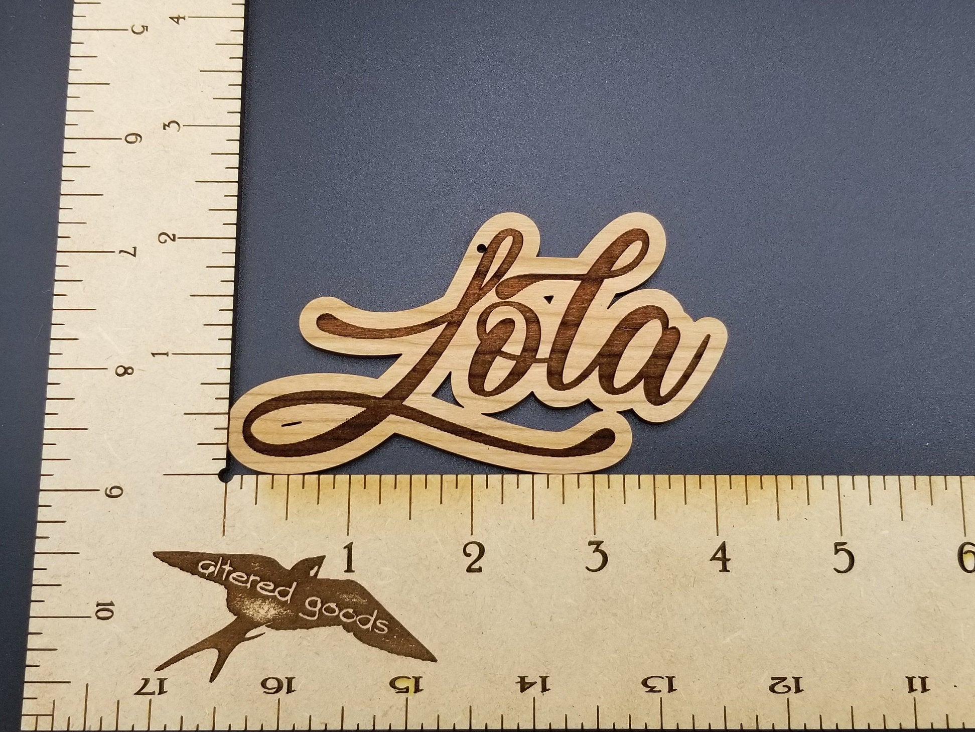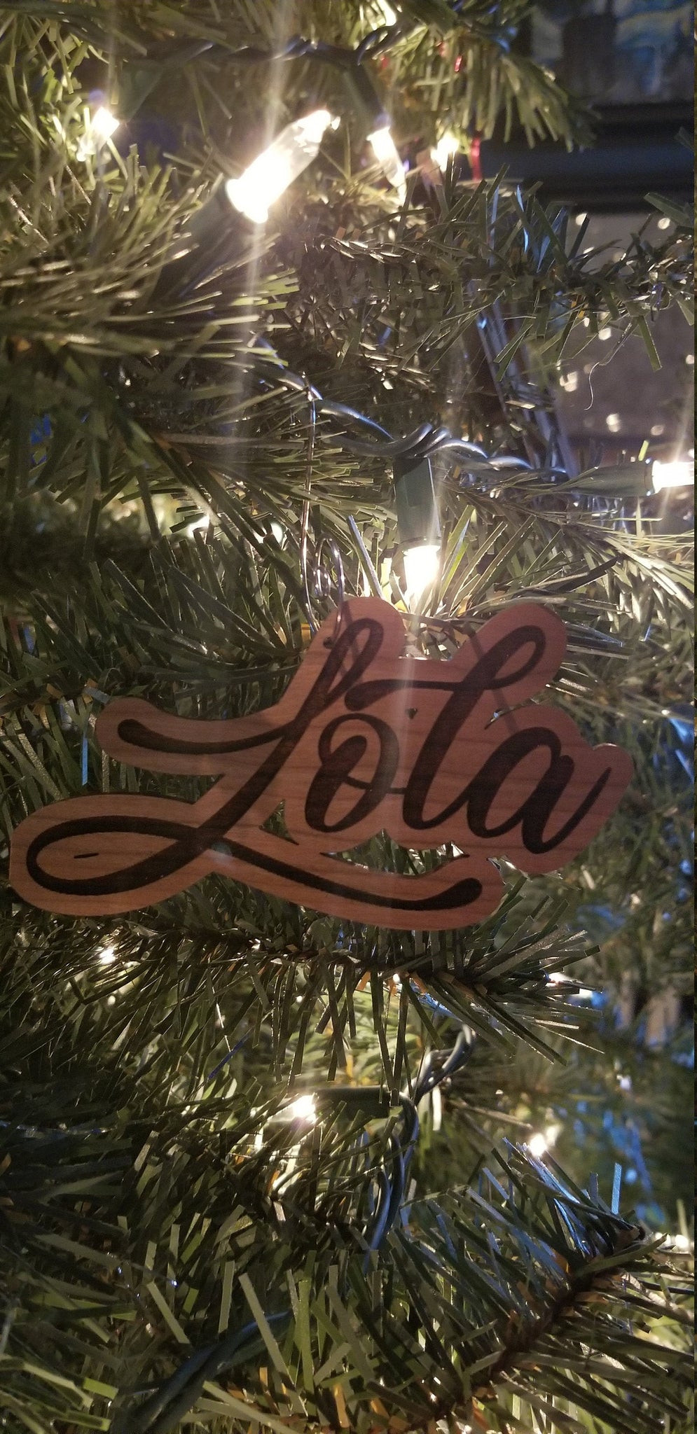 Laser engraved 2 inch tall cherry hardwood name ornament with our logo on the back. Length of ornament will vary by length of name.