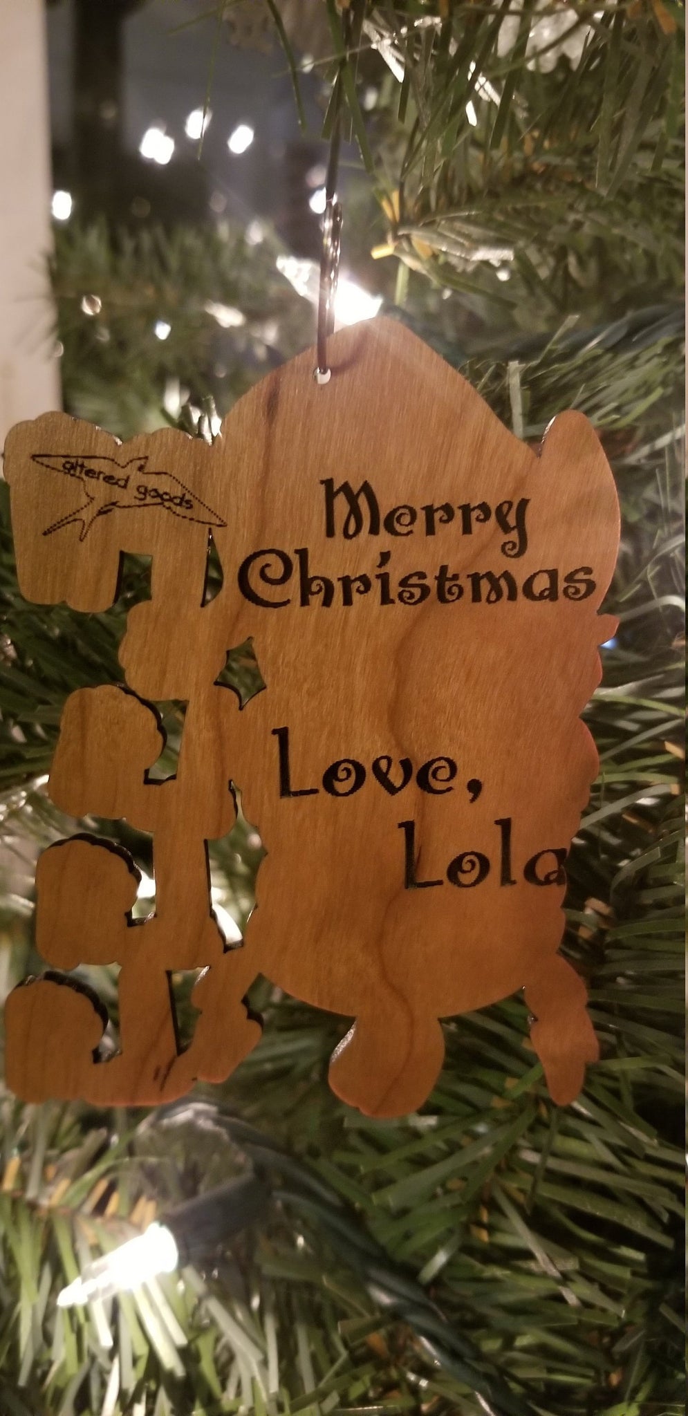 Laser engraved 3.5 inch long cherry hardwood ornament with fa la la llama on the front and our logo on the back. Can add a name or message to back, add details in the note to seller.