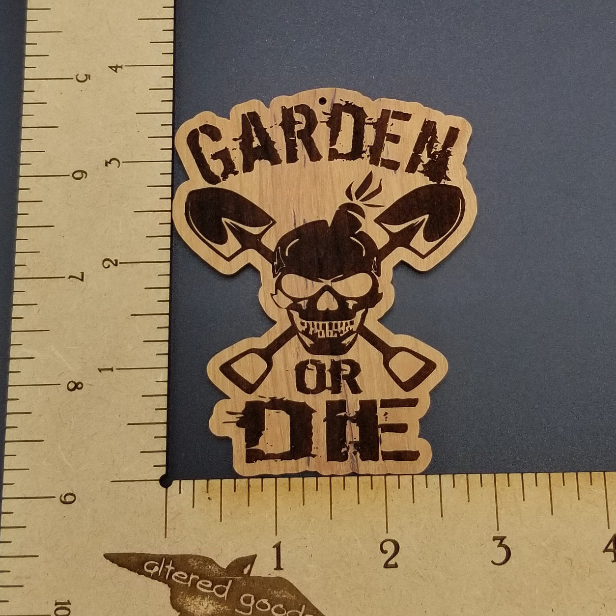 Laser engraved 3.5 in. cherry hardwood ornament with garden or die design on the front and our logo on the back. Can add a name or message to back, add details in the note to seller.