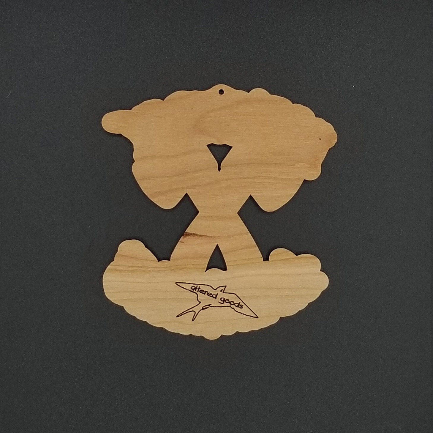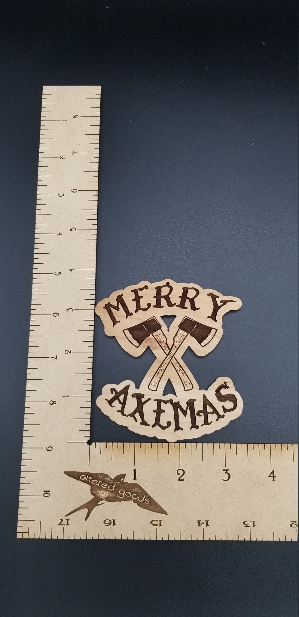 Laser engraved 3.75x3.25 in. cherry hardwood ornament with merry axemas design on the front and our logo on the back. Can add a name or message to back, add details in the note to seller.