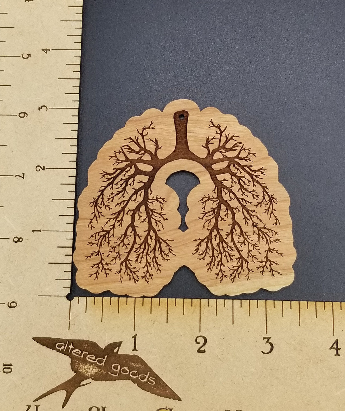 Laser engraved cherry hardwood lung ornament with new lungs who dis? On back.