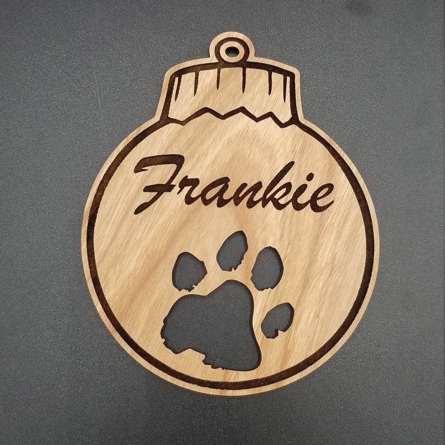Laser engraved 4 inch tall cherry hardwood ornament with our logo on the back. Laser engraved name and cut out paw print. Please add the name you would like in the note to seller.