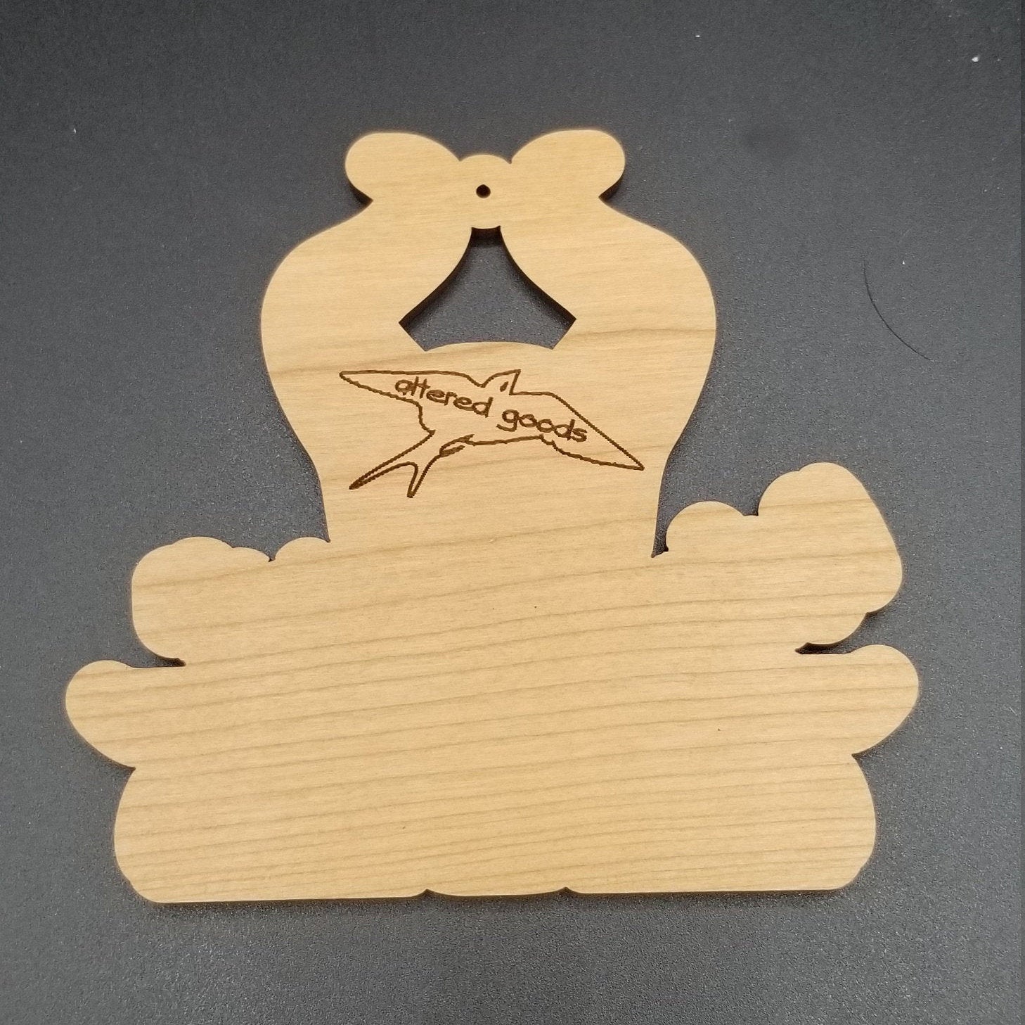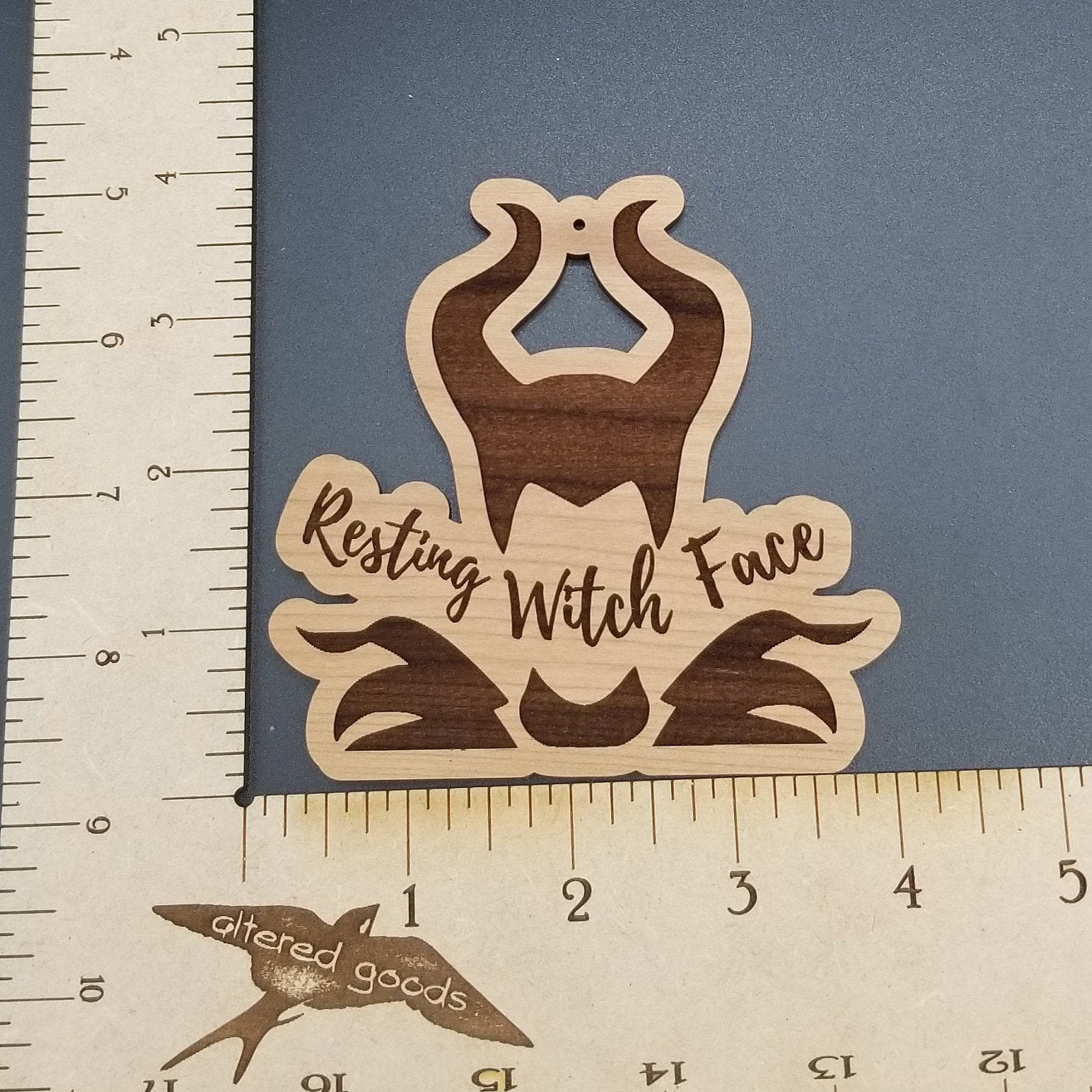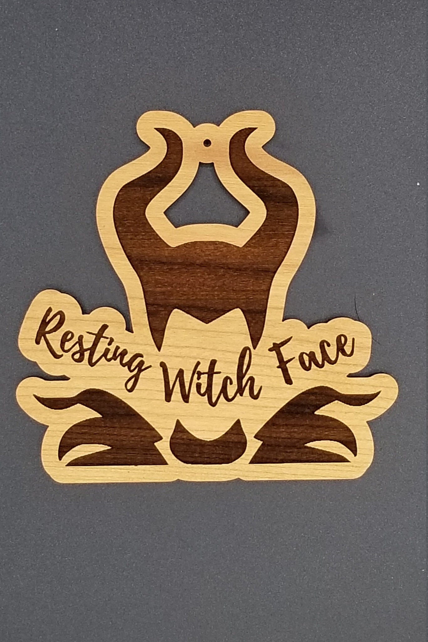Laser engraved 4 inch tall cherry hardwood with resting witch face design on front and our logo on back. If adding a name please note it in the note to seller.