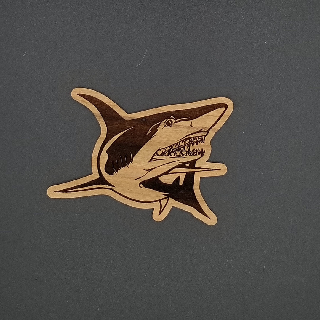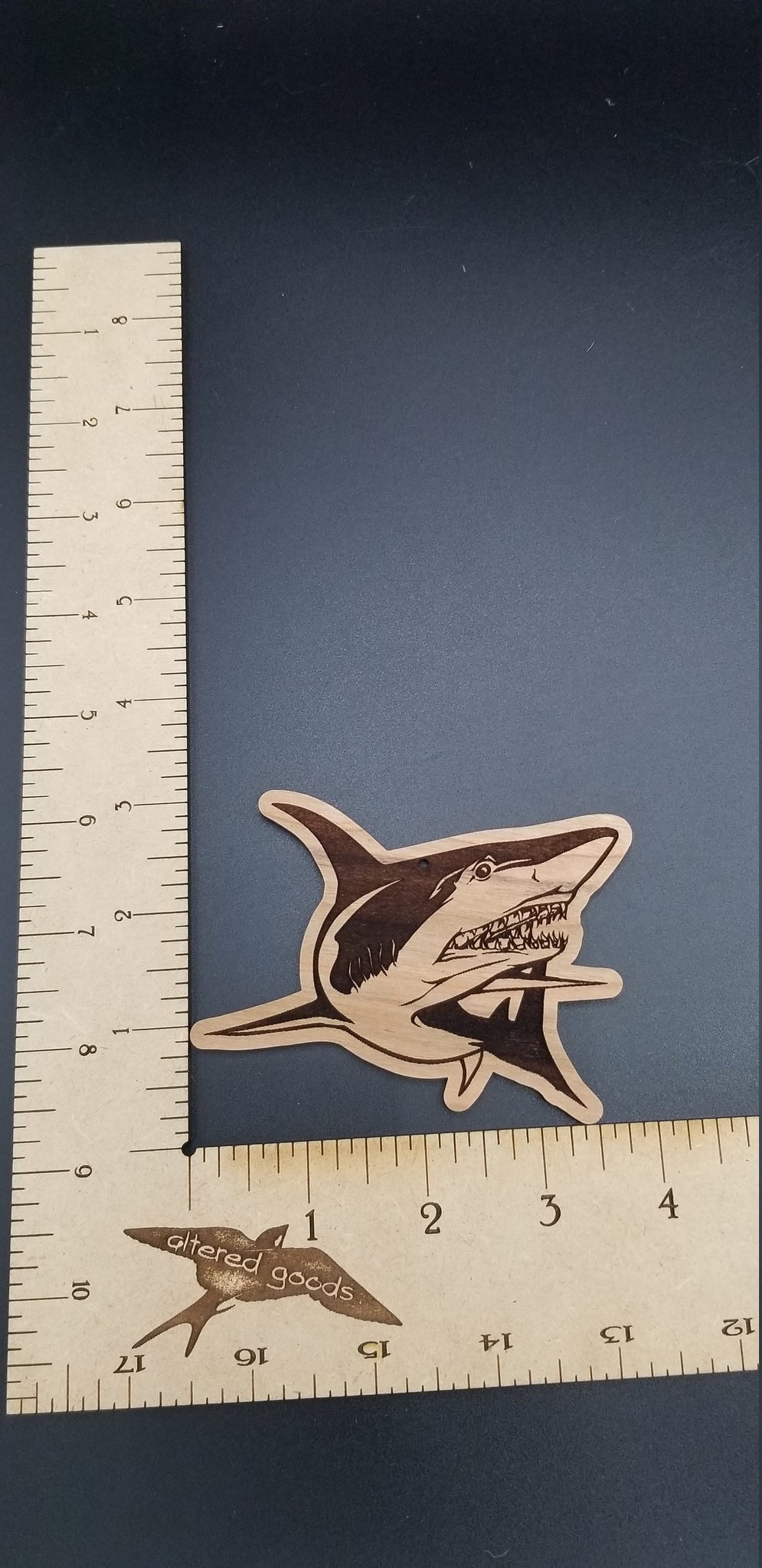 Laser engraved 3.5x4 in. cherry hardwood ornament with shark design on the front and our logo on the back. Can add a name or message to back, add details in the note to seller.