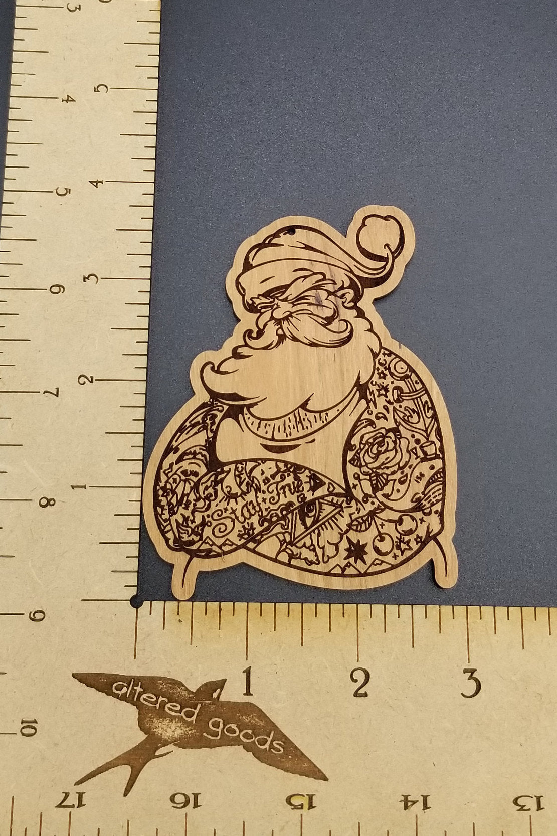 Laser engraved 3.5 in. cherry hardwood ornament with tattoo santa design on the front and our logo on the back. Can add a name or message to back, add details in the note to seller.