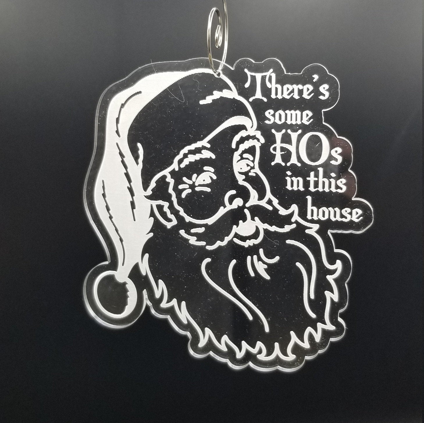 Laser engraved 4in x 3.75 in.acryclic ornament with santa and "There's some HOs in this house" engraved on the back so the front is smooth.