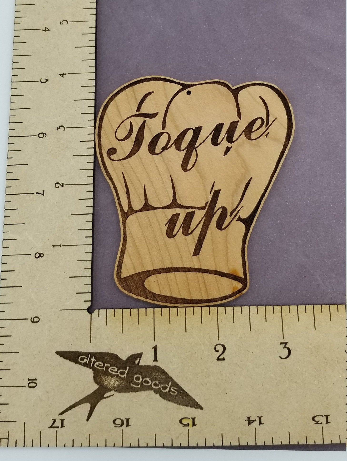 Laser engraved 4 inch long cherry hardwood ornament. Toque up design on one side and our logo on the back for the plain option. If you choose the custom option a name of your choice and a small version of our logo will be on the back. Please make note of the name in the note to seller section.
