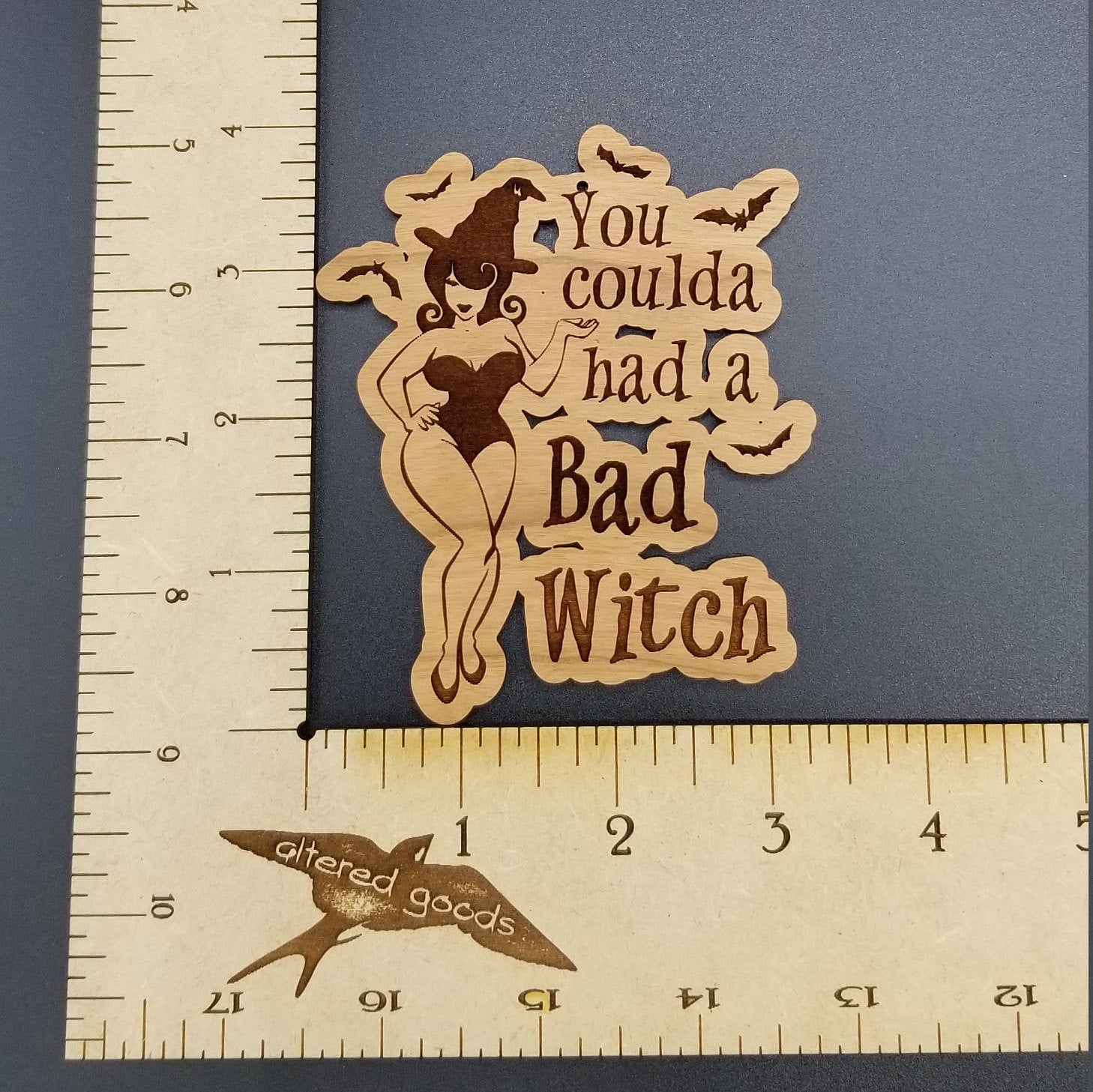 Laser engraved 4 inch tall cherry hardwood with pin up witch design on front and our logo on back. If adding a name please note it in the note to seller.
