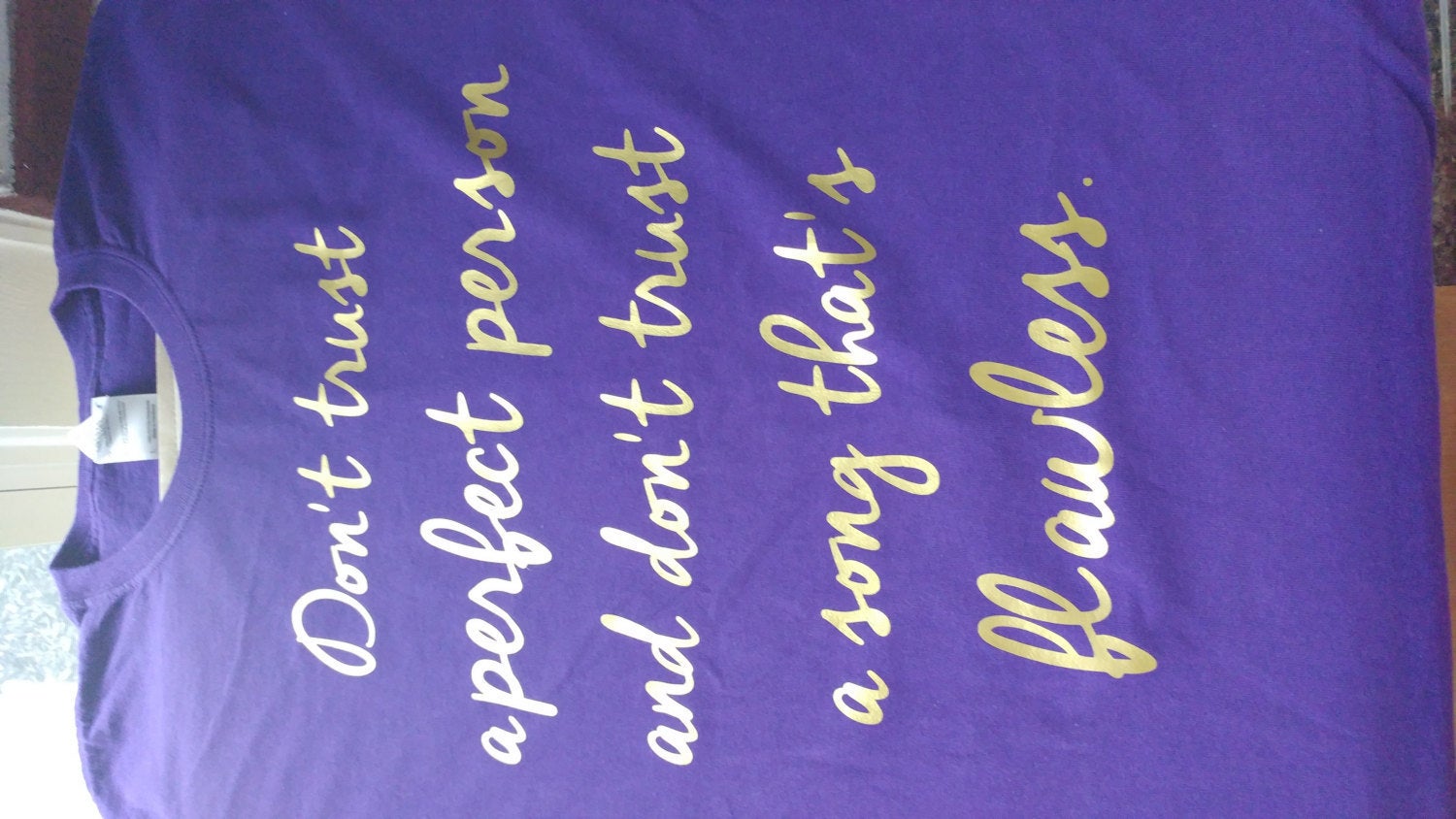 Purple shirt with gold writing. Front says don't trust a perfect person and don't trust a song that's flawless. Back says stay in your lane boy with altered goods logo. Can be put on any item just ask