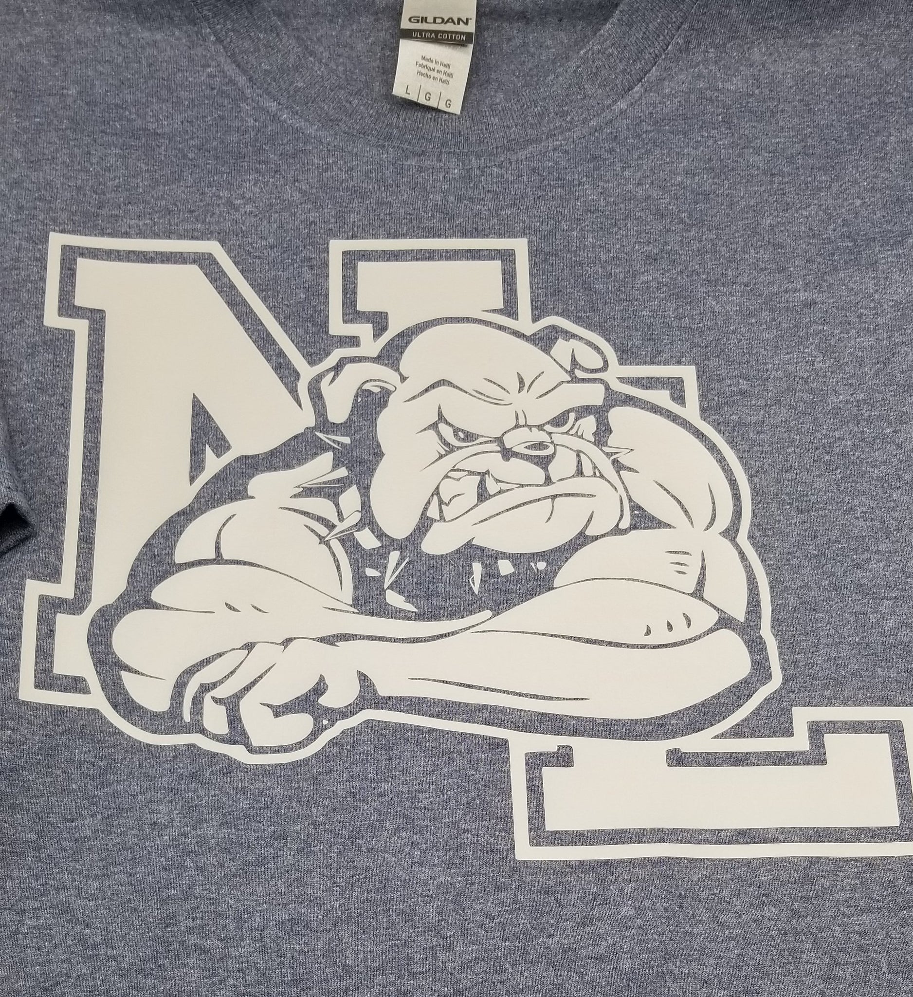 Heather navy shirt with grey design on front and altered goods logo on back. Can be put on any item just ask