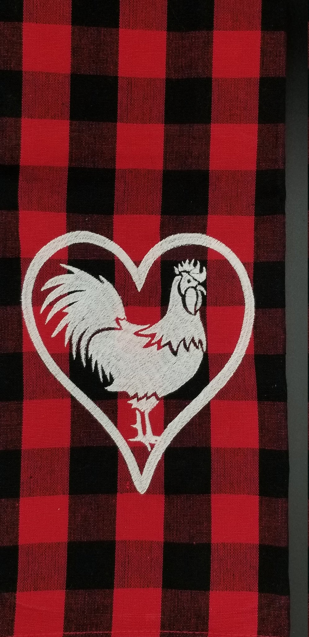 Red and black plaid kitchen towel with white embroidered cock in a heart. Towel is 100% cotton, 20 inch by 30inch open and 6.5 wide by 14.5 long as folded for display.