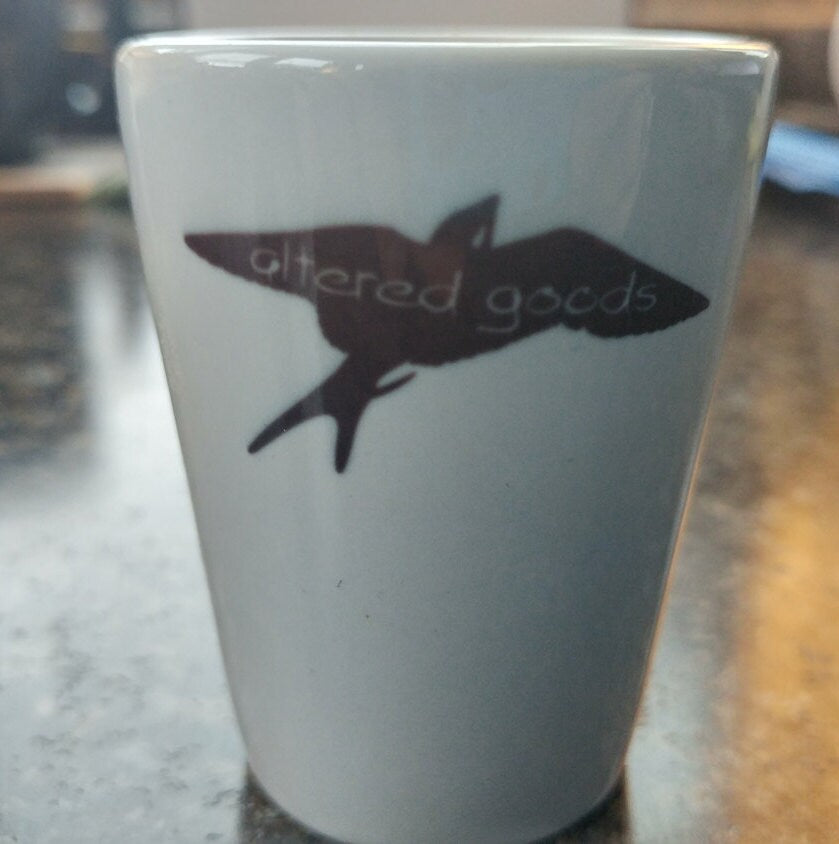 White ceramic shot glass with fluff you cat design on front and altered goods logo on other side. Please excuse the screen shot while I make samples.