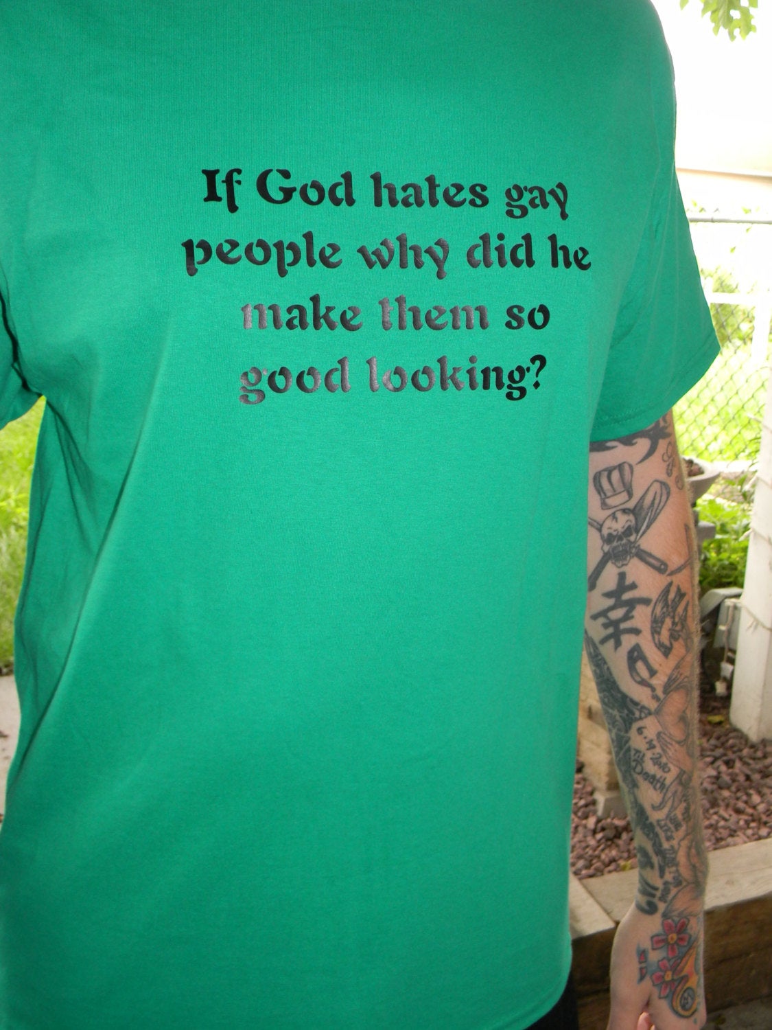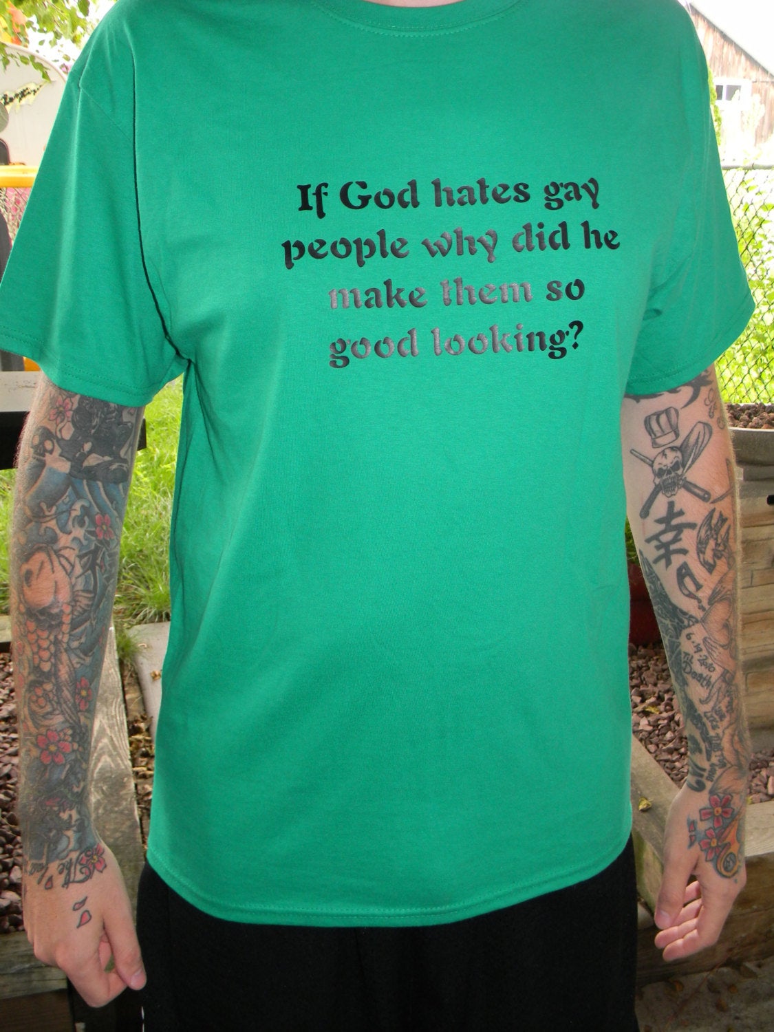 If god hates gay people why did he make them so good looking? Tshirt. http://www.mygildan.com/Categories/T-Shirts/Short-Sleeve//p/5000 these are the basic shirts we use to give an idea on size and color options. This design can be put on other shirts, sweatshirts, hats, mugs, etc. Email for price