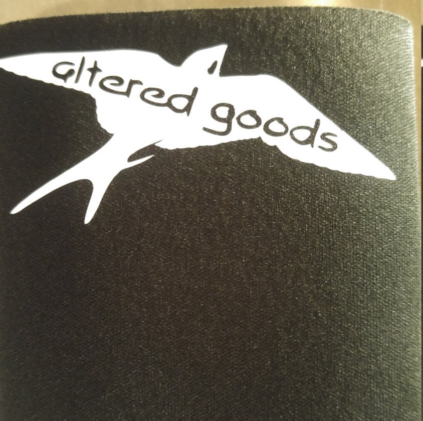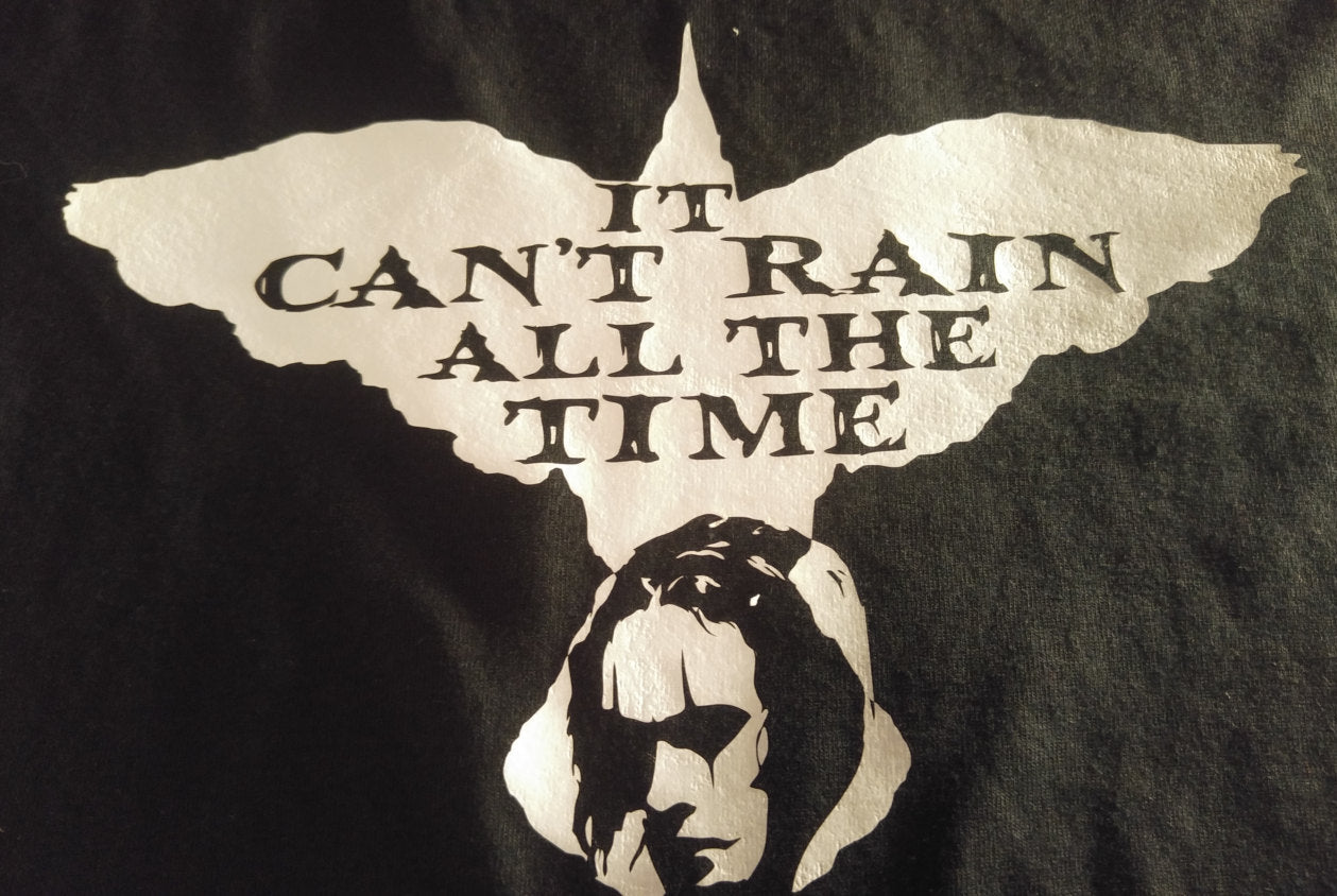 Black t shirt with white crow silhouette and quote it cant rain all the time with the crow face at bottom. Altered goods logo on back shoulder. Design can be put on any item just ask.