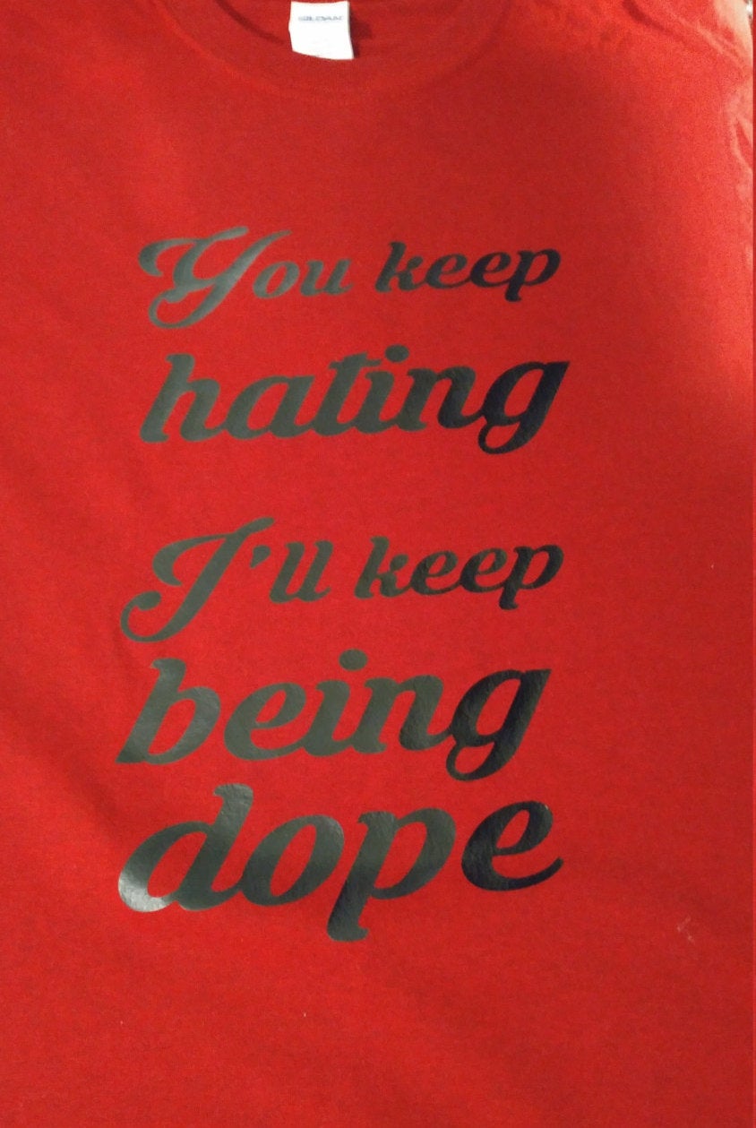 You keep hating ill keep being dope black design on red shirt. Altered goods logo on back. This design can be put on other shirts, sweatshirts, hats, mugs, etc. Email for price